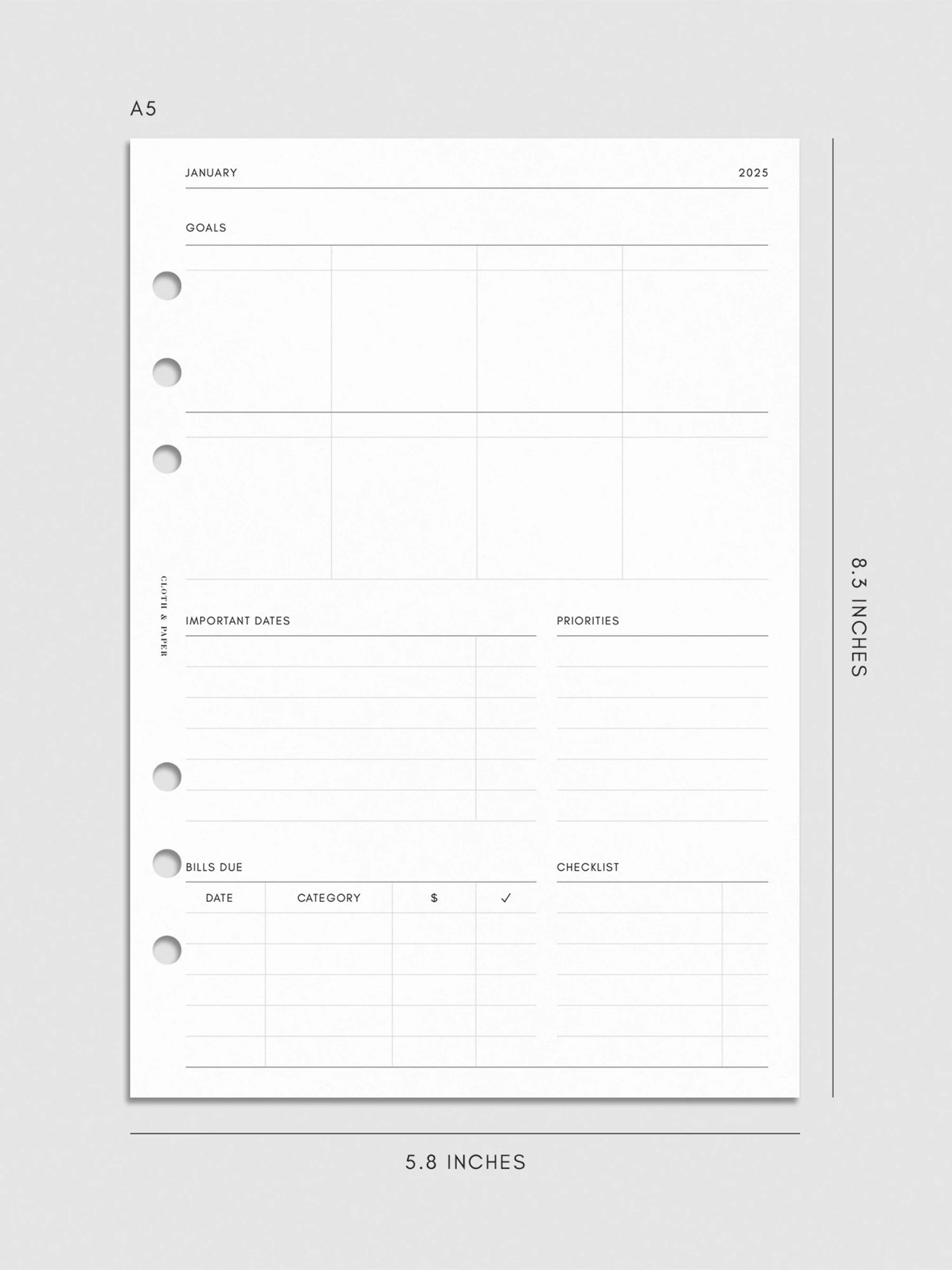 - Monthly Overview page: month header, goals, important dates, bills due, lined list
