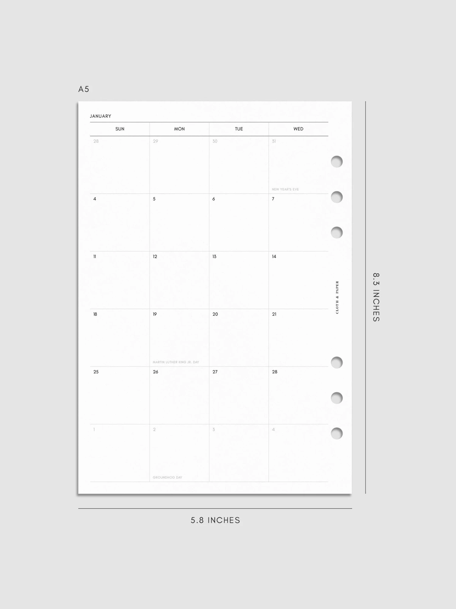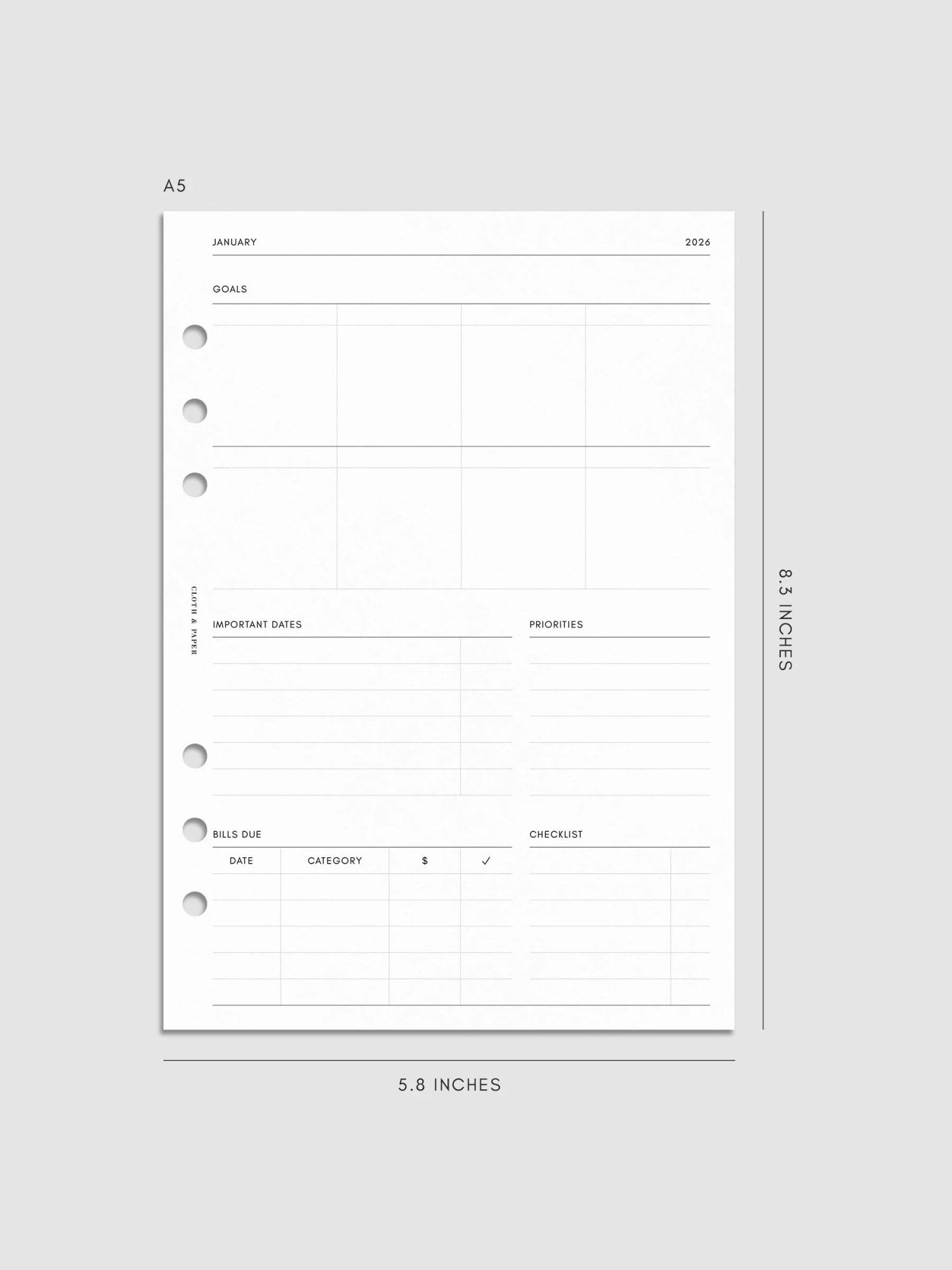 Listing is for 2026 Dated Monthly Planner Inserts | Sunday Start only.