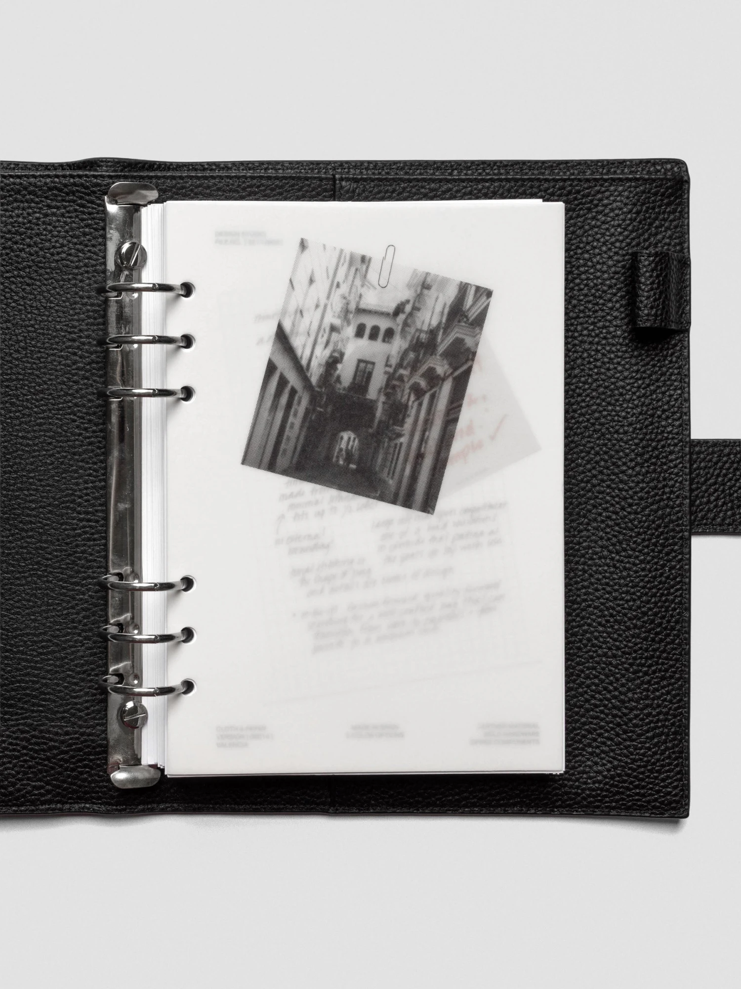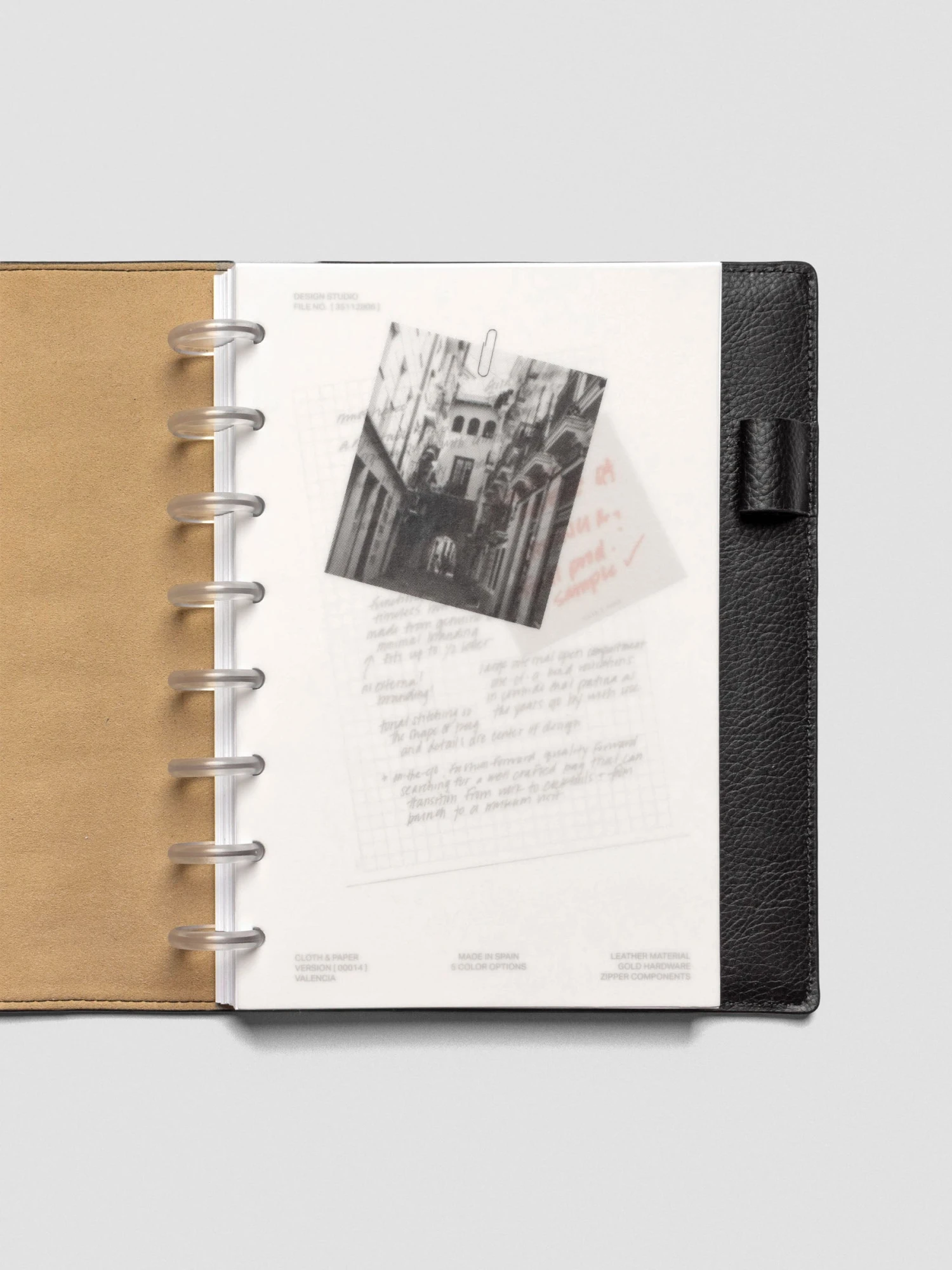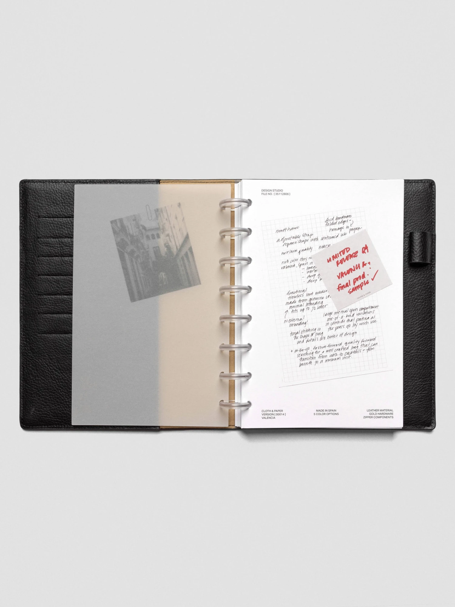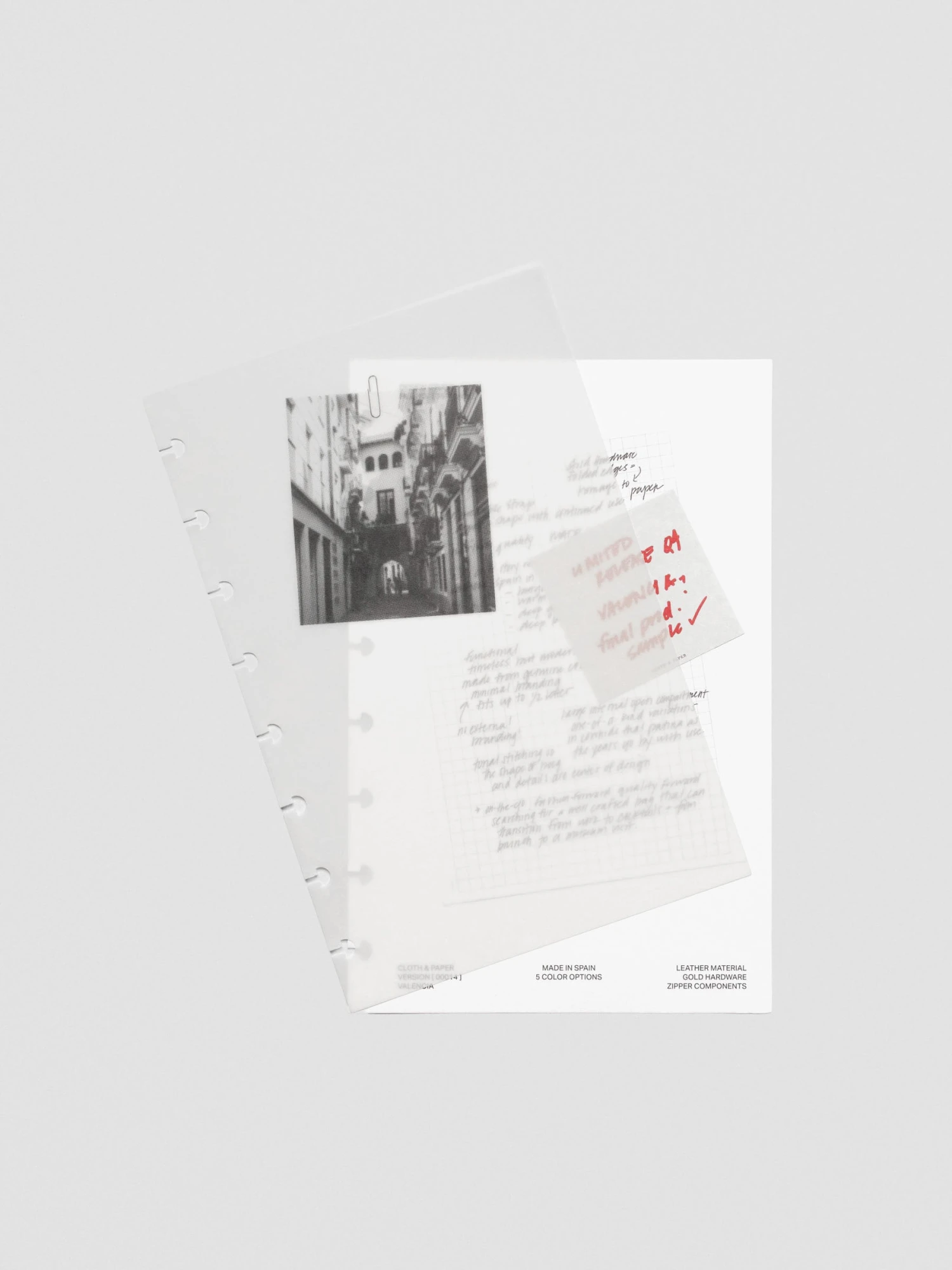 The top layer is a heavyweight vellum overlay, featuring a black-and-white halftone photo of a city street in Valencia, Spain. Beneath it, a thick white cardstock sheet reveals a snapshot of our design journey — complete with handwritten notes from Ashley and a playful faux sticky note in bold red ink. Together, the duo is a reminder that creativity is as much about the journey as the final piece.