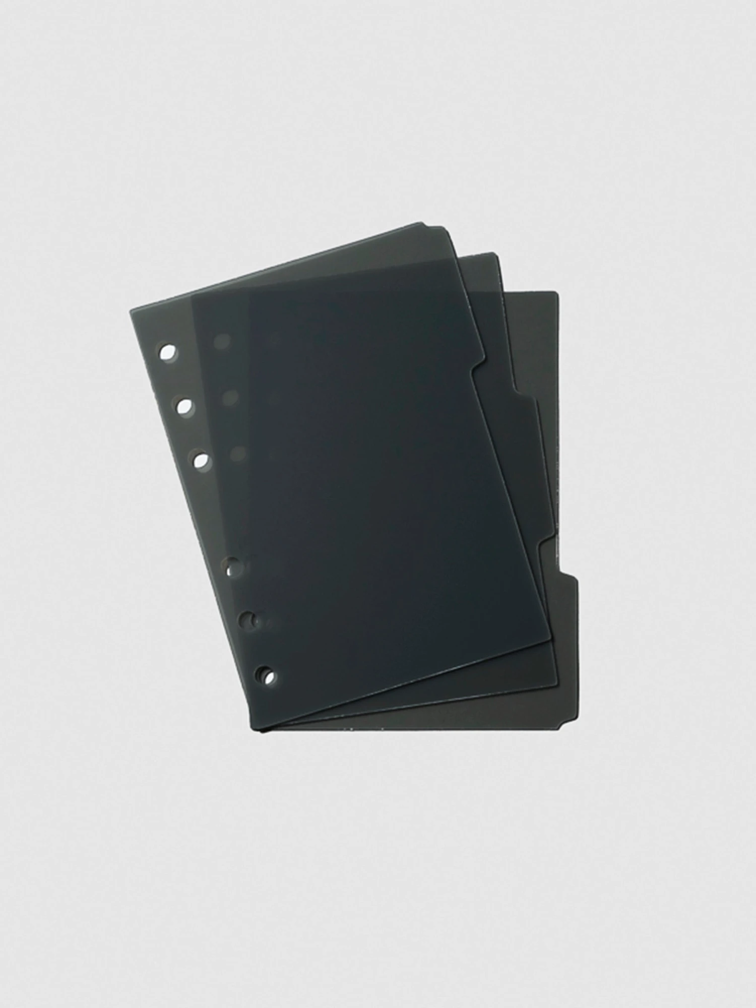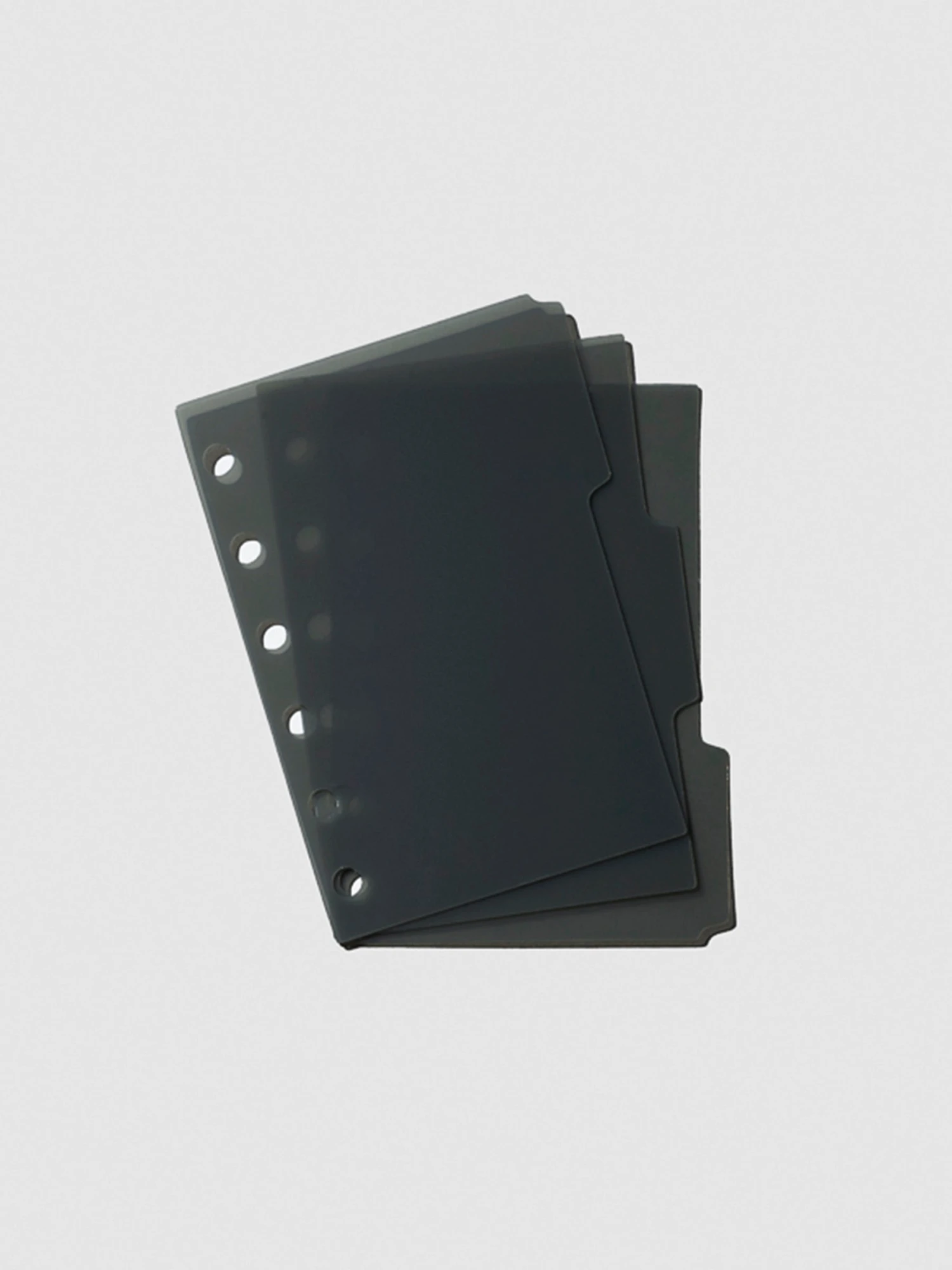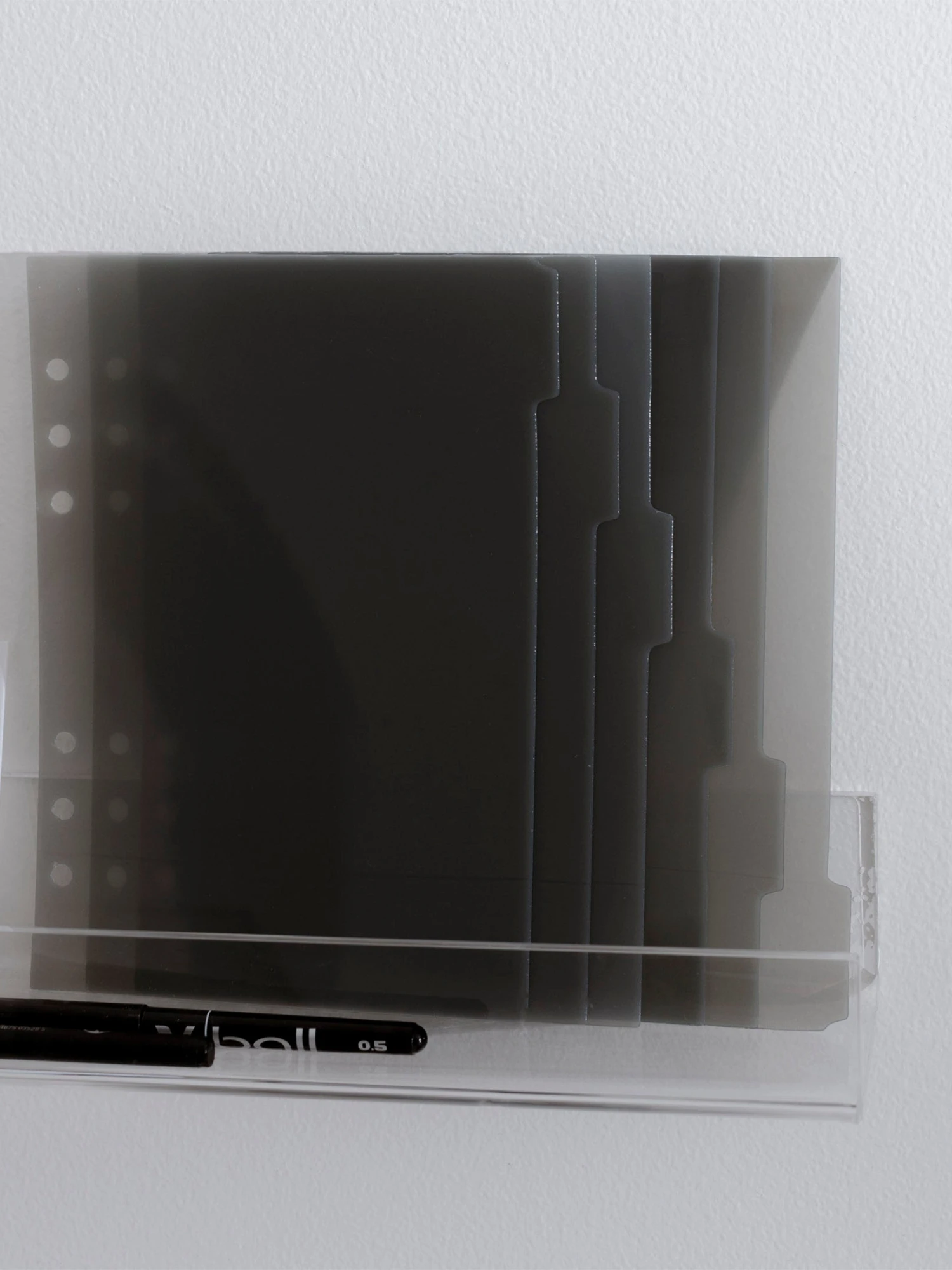 Our Tinted Planner Dividers feature a clear, gray tinted look. Crafted from durable plastic, these dividers are built to withstand daily use while maintaining their pristine look. This gray tint offers a touch of sophistication and privacy without overpowering the aesthetic of your planner. This product arrives with protective film on each side of each divider, which can be removed by hand or with a pair of tweezers.
