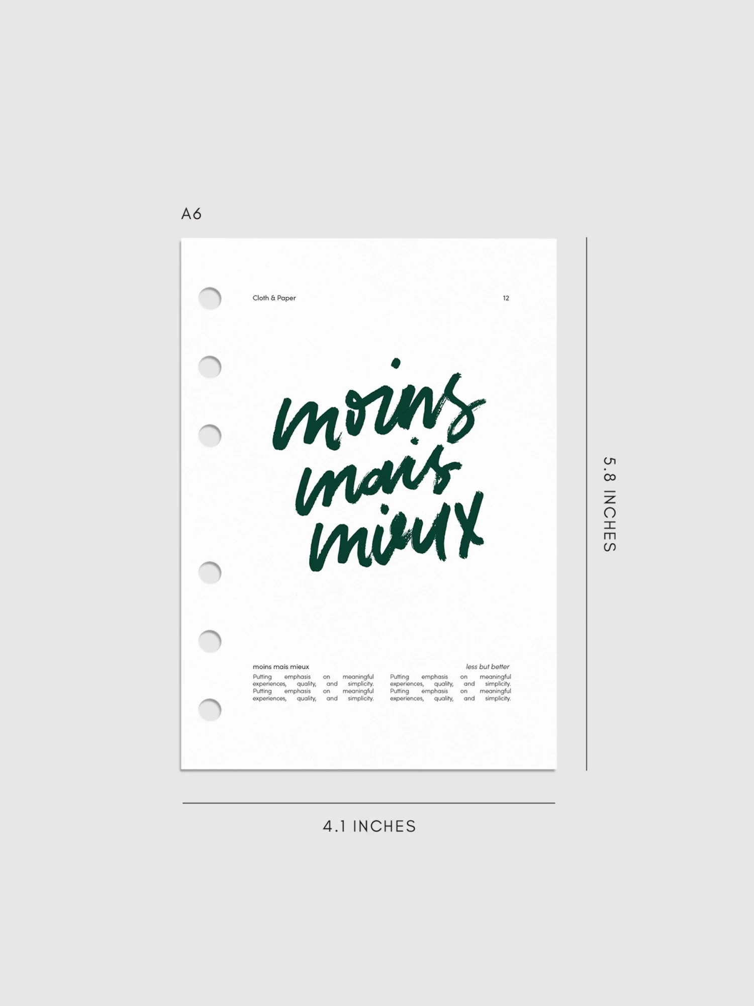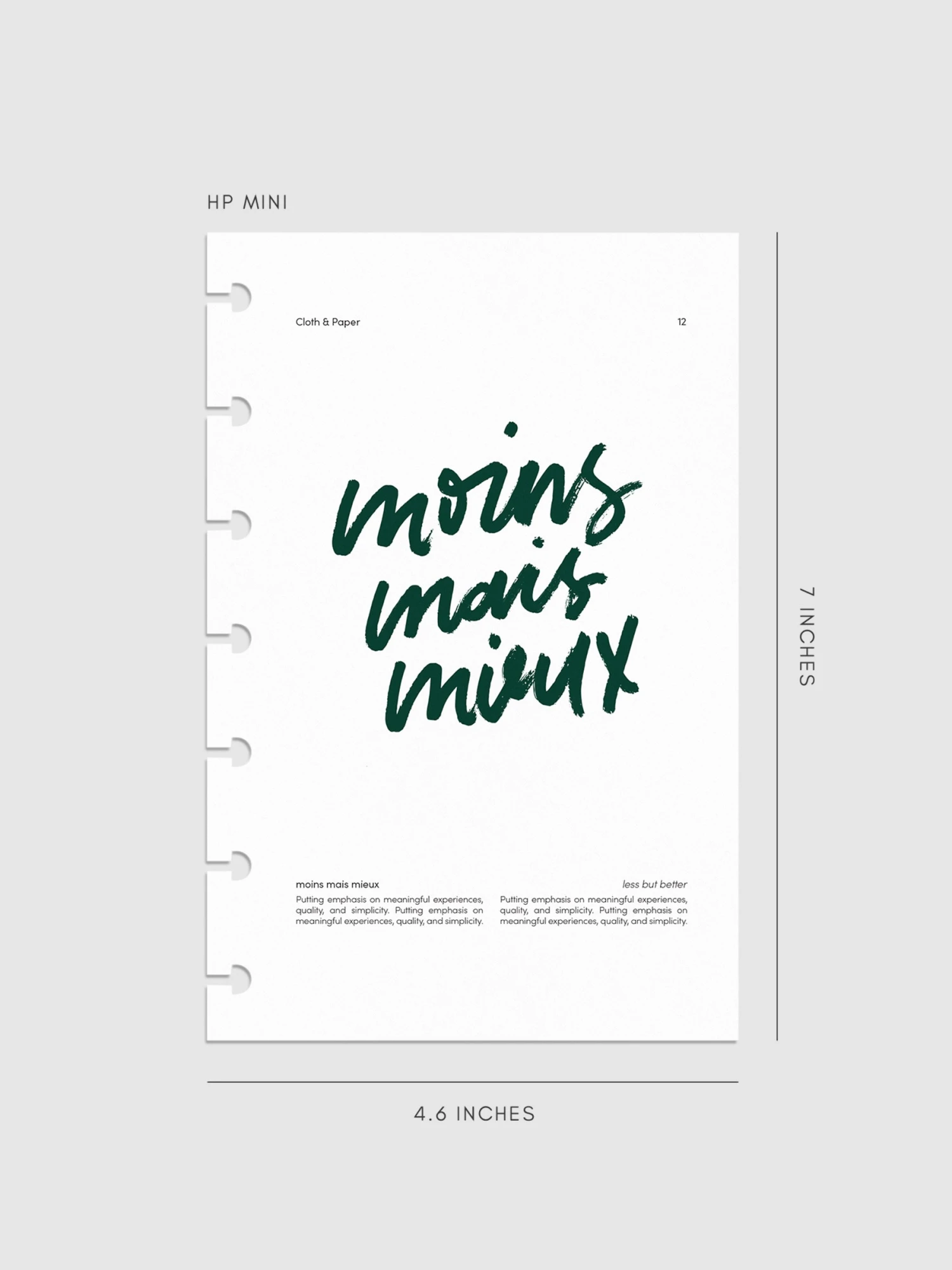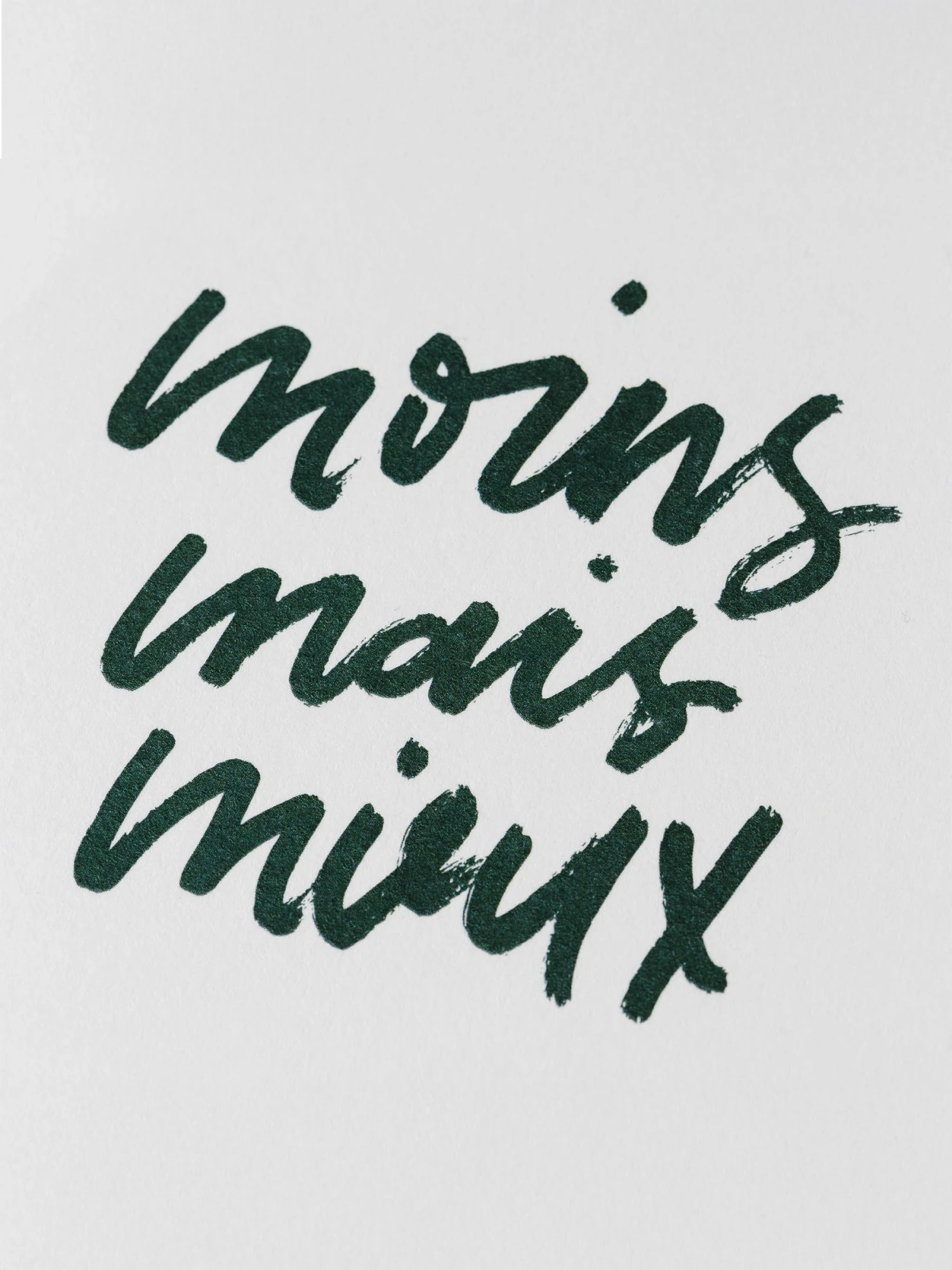 - Has the French phrase “Moins Mais Mieux”, meaning “less, but better” printed in a rich dark green ink. Also includes a repeating definition printed in black ink