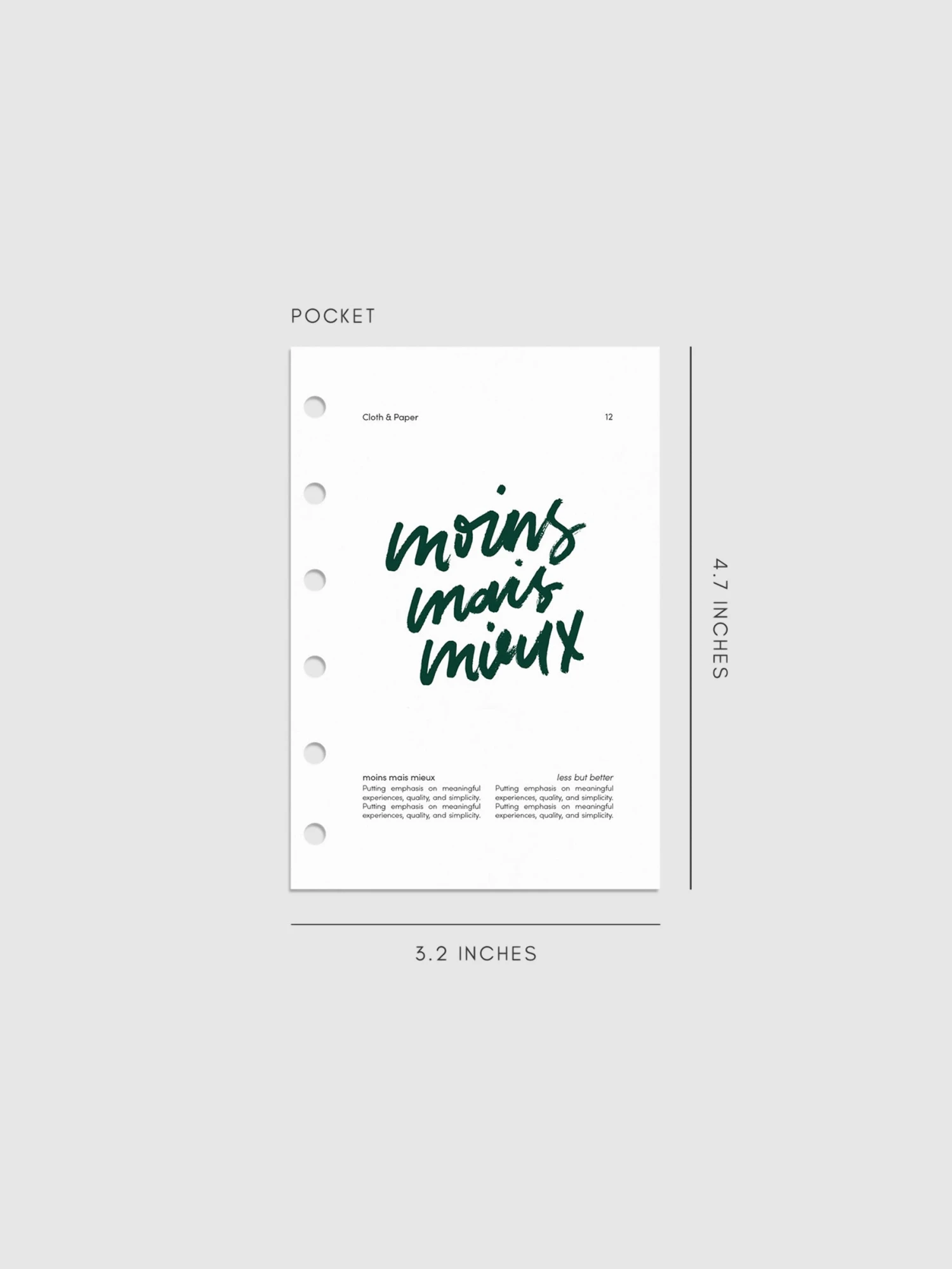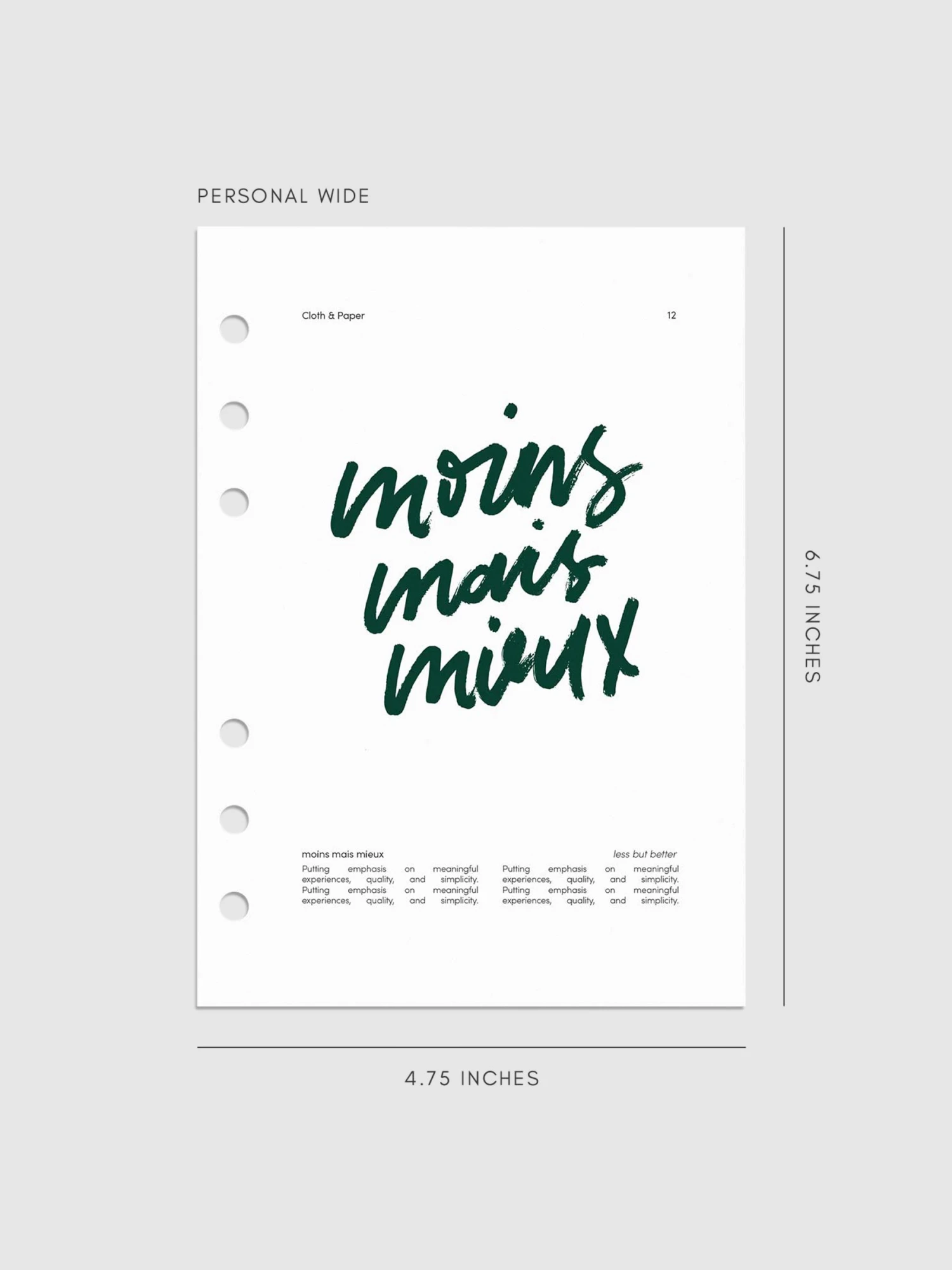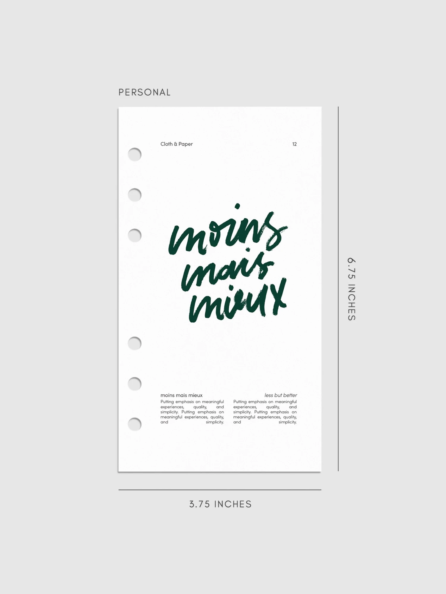 - Has the French phrase “Moins Mais Mieux”, meaning “less, but better” printed in a rich dark green ink. Also includes a repeating definition printed in black ink